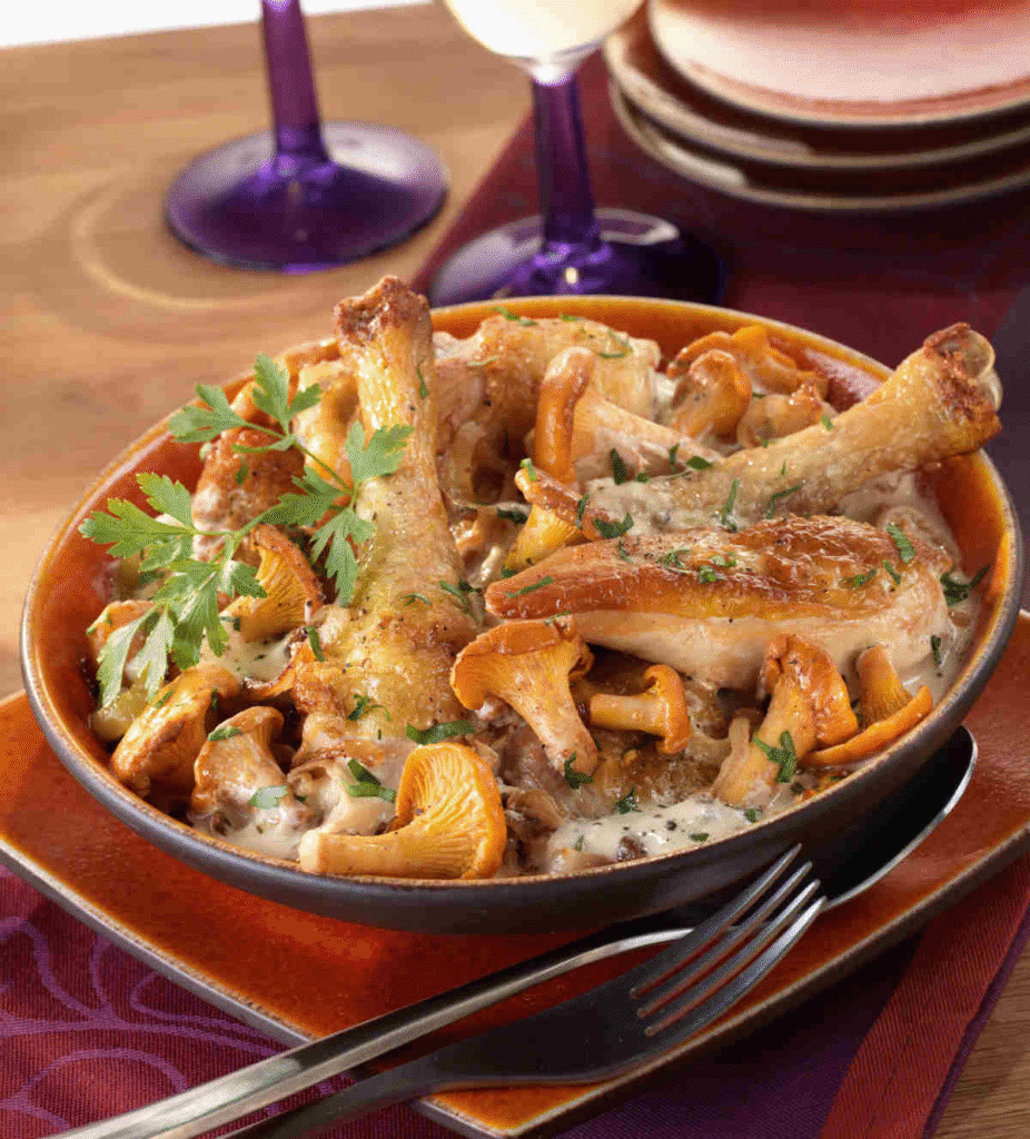 The Nitty-Gritty: Chicken cooked in a delicate sauce of dry Riesling, cream, mushrooms, and herbs.