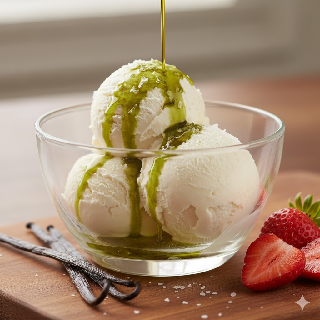 Vanilla Ice Cream & Olive Oil + SaltSweet vs. Pungent, Richness & SaltDecadent, Velvety, Savory-Sweet, Surprisingly FreshGourmet Desserts, Indulgent TreatsMedium