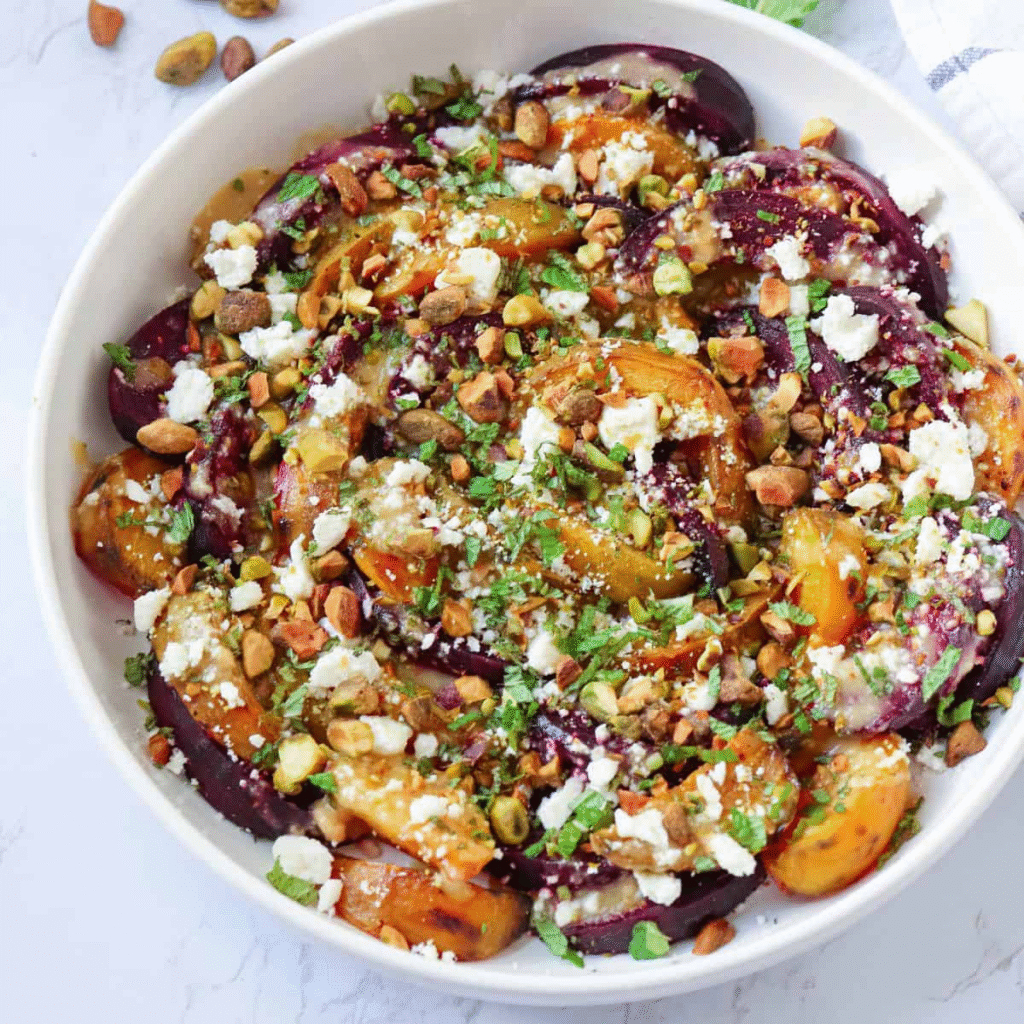 Okay, we are taking a full 180-degree turn from dense, fudgy decadence to something that is visually stunning, texturally complex, and ridiculously healthy. This Roasted Beet and Orange Salad is not boring “diet food.” It is an absolute explosion of contrasting flavors! You get the deep, earthy sweetness of the roasted beets, the sharp, almost electric tang of fresh orange segments, and the crucial salty, loud crunch of the pistachios.
