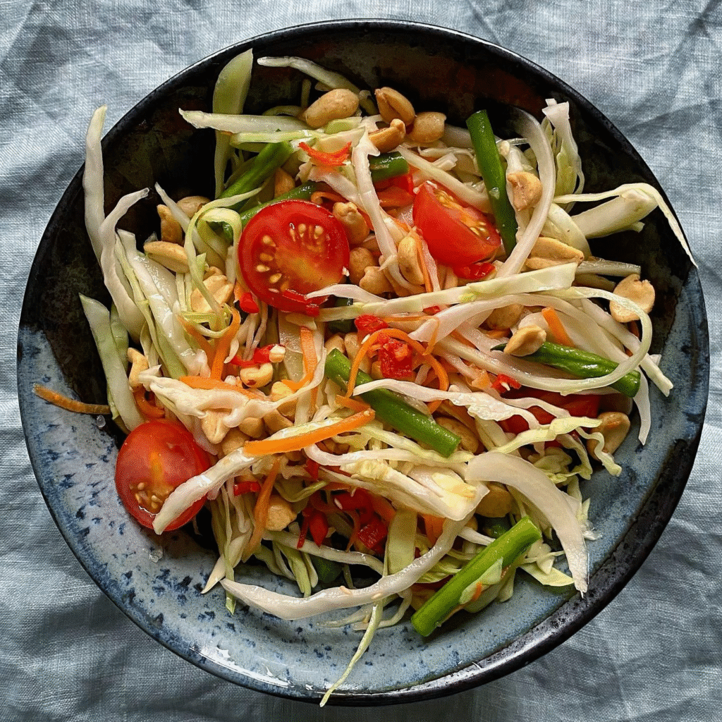 Taste test a small piece of papaya. It should be aggressive—sweet, sour, and hot. If it’s too sour, add more sugar. Too sweet, add more lime. Now, stir in the chopped peanuts (save a few for garnish!). Dump the whole darn thing onto your serving platter and garnish with the reserved peanuts. Serve immediately with those cool cabbage leaves on the side. When you smell that final bowl, you’ll know it’s perfect—it’s that funky, electric smell! Give it a taste before you serve it, ya gotta trust your gut.
