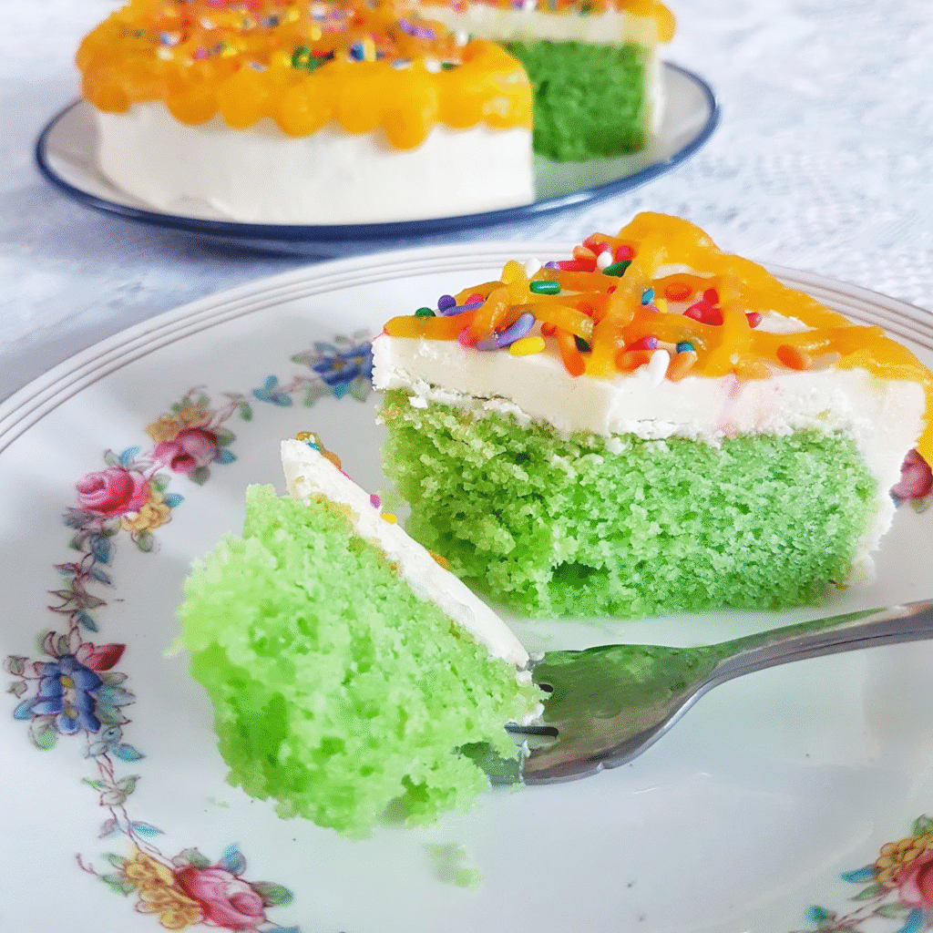 Whisk flour, baking powder, and salt in one bowl. In another, whisk egg yolks, oil, half the sugar, and pandan juice. The color will be soft green at first, then intensify as it sits — pandan is dramatic like that. Fold dry into wet gently. Now whip the egg whites with the rest of the sugar until soft, glossy peaks form — like little snowy mountains that wobble when you tap the bowl. Fold them into the batter like you’re coaxing secrets out of it. Pour into a lined pan and bake until the top springs back when you poke it (gently — we’re not playing whack-a-mole).