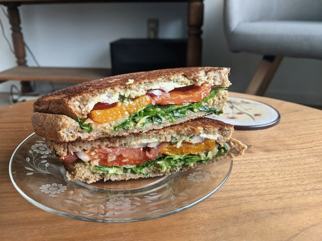 On the bottom half, layer your slices of cheese. Then, arrange the beautiful, slippery strips of roasted red pepper over the cheese. Pile the arugula on top of the peppers. The peppery bite of the arugula is the perfect fresh counterpoint to the rich, smoky peppers and salty relish. If you’re using peperoncini or hot honey, add it now.