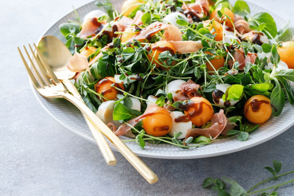 - Layer and Drizzle: Remove the cold melon from the fridge and gently scatter it over the greens. Now, take the prosciutto slices and tear them into rustic pieces; let them fall artfully over the melon and greens—you want that silky drape!