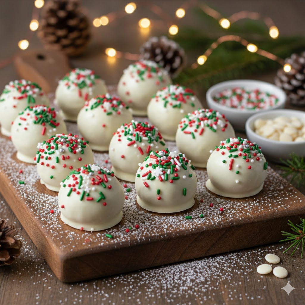 - Dip & Decorate! Take your chilled truffles out of the fridge. Using a fork or a dipping tool, dip each truffle into the melted white chocolate, ensuring it’s fully coated. Gently tap off any excess chocolate. Immediately place the coated truffle back on the parchment-lined baking sheet. Before the chocolate sets, sprinkle with your favorite festive sprinkles! This is where you can get super creative!