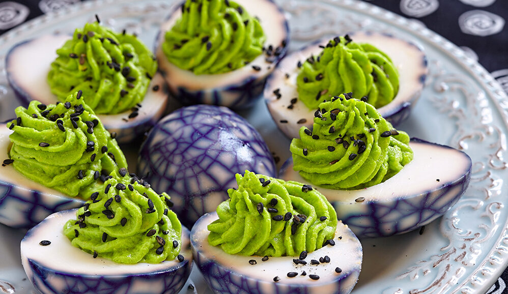 - The Pipe & Garnish: Scoop the yolk mixture into a piping bag fitted with a star tip (or just use a Ziploc bag with a corner snipped off). Pipe the filling generously back into the blue-veined egg whites. Garnish with a small dusting of paprika or a few ominous black sesame seeds right in the middle. Killer!